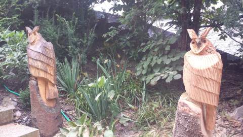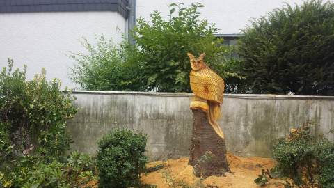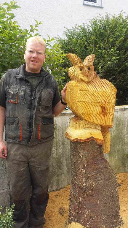 Haben Sie einen Baum im Garten stehen der gefällt werden muss? Gerne säge ich Ihnen aus dem Stamm eine Eule oder ein anderes Tier!